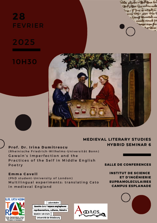 Le 8 novembre 2024, dans le cadre du séminaire Medieval to Renaissance, nous aurons le plaisir d'accueillir : Tatjana Silec (Sorbonne Université) et Denis Lagae-Devoldere (Sorbonne Université) pour une communication intitulée Honni soit qui mal pense. L'horizon aporétique dans Twelfth Night et Si…